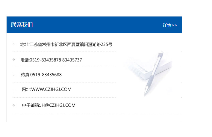 地址:常州市新北區友邦商務大廈1幢16、17層  電話:0519-85101652  傳真:0519-85112595  郵編:213022  網址:www.cz-jiayue_cn.hnwjyl.com  郵箱:xiajifengaa@163.com